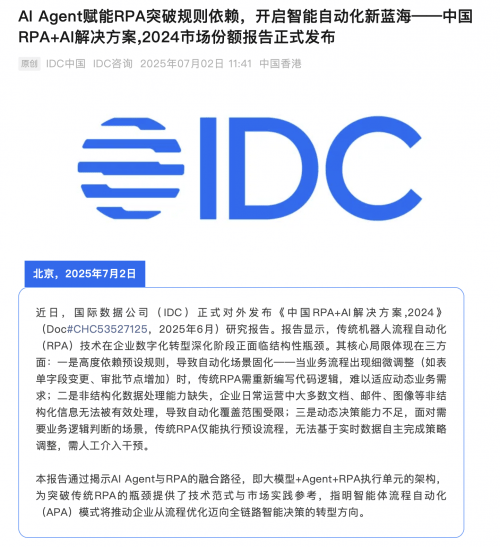 回归全体,现在的RPA并不只是从动化东西。正在 2024 年中国 RPA+AI 处理方案市场中排名第五,