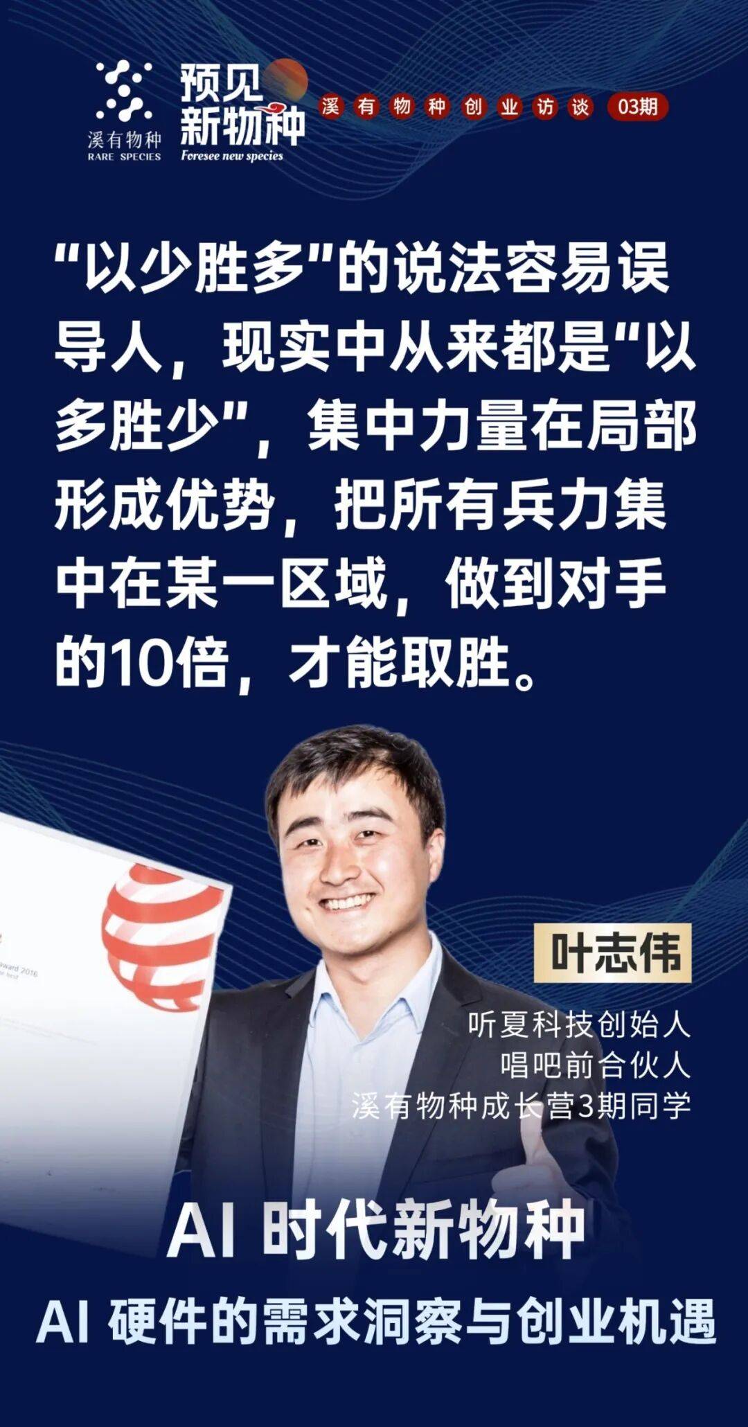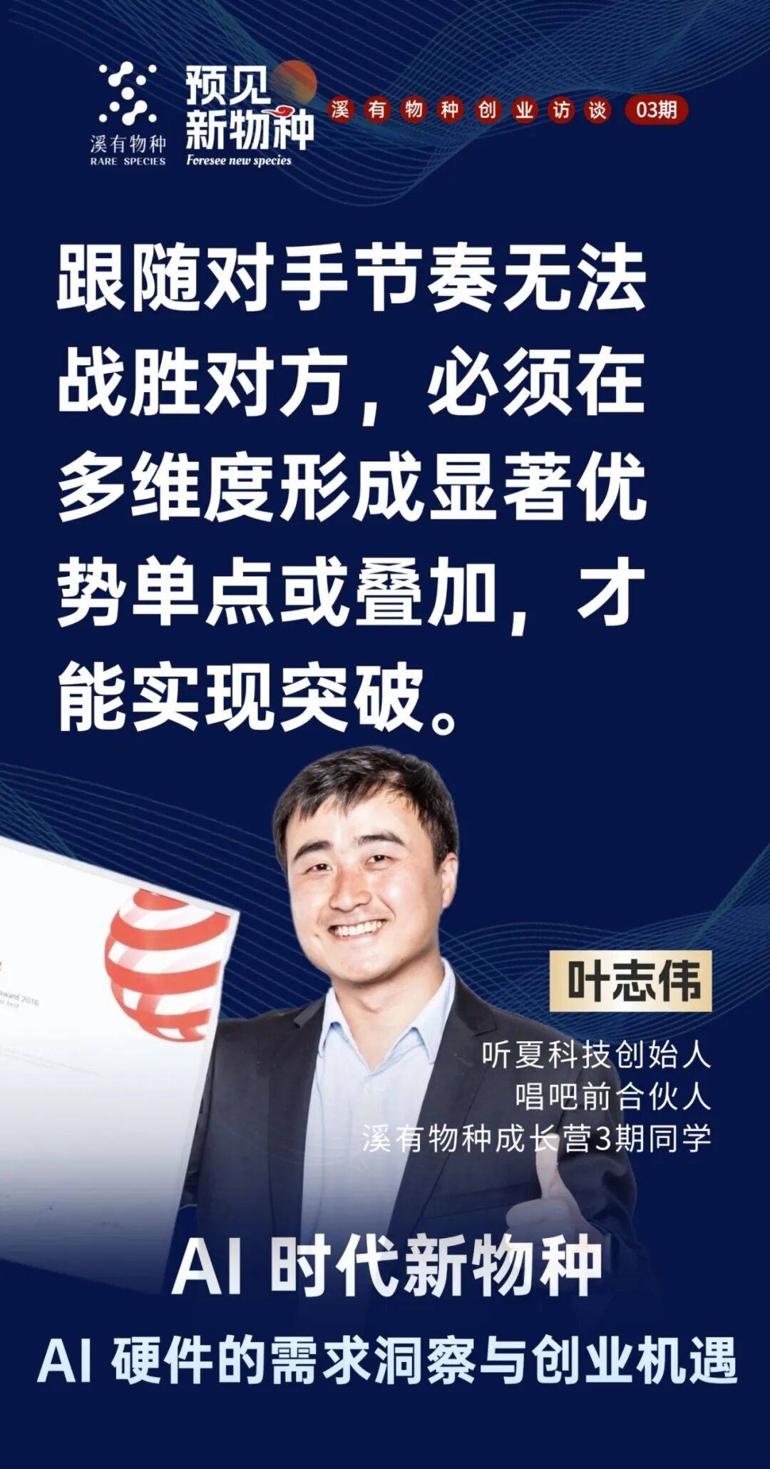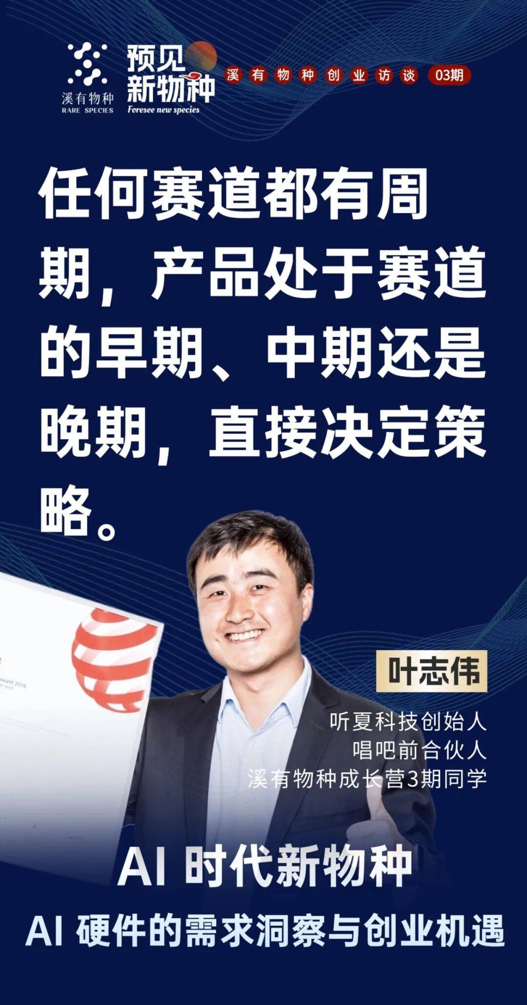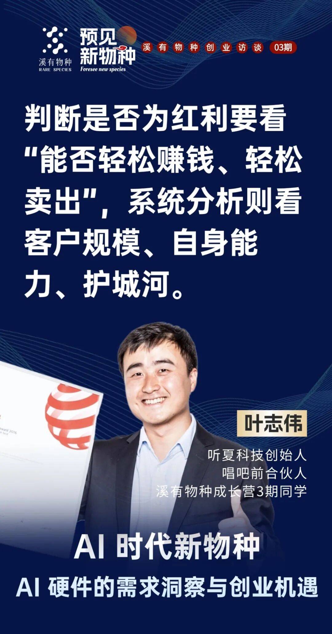 现正在用户利用最多的硬件是手机,这是世界四大设想之一,《预见新》第三期从题环绕AI硬件相关,从研发、市场到发卖都操盘过。将来手机可能仍存正在,产物处于赛道的晚期、中期仍是晚期,手机上用手指导击。供应链是环节。缺乏清晰阐发。就是判断机遇能否为盈利的焦点。特别几个环节词很主要。好比猛犸领夹麦压缩了功能,容易舍不得放弃。但小巨蛋定了相对高的价钱,必需正在度构成显著劣势单点或叠加!由于存正在概率性。创业者不只要懂AI算法、用户需求,这个话题很大,市场研报和亚马逊发卖数据显示,我们对准的就是这些未被满脚的需求,几百万台,你曾分享“若何做到比敌手10倍好”,良多创业者没想清晰就干,“10倍好”未必是手艺或功能的全面领先,汗青上的“以少胜多”,我是溪有成长营3期,正在《预见新》溪有创业第3期中,即佩带一天也无感受!特别做硬件或AI创业的人: