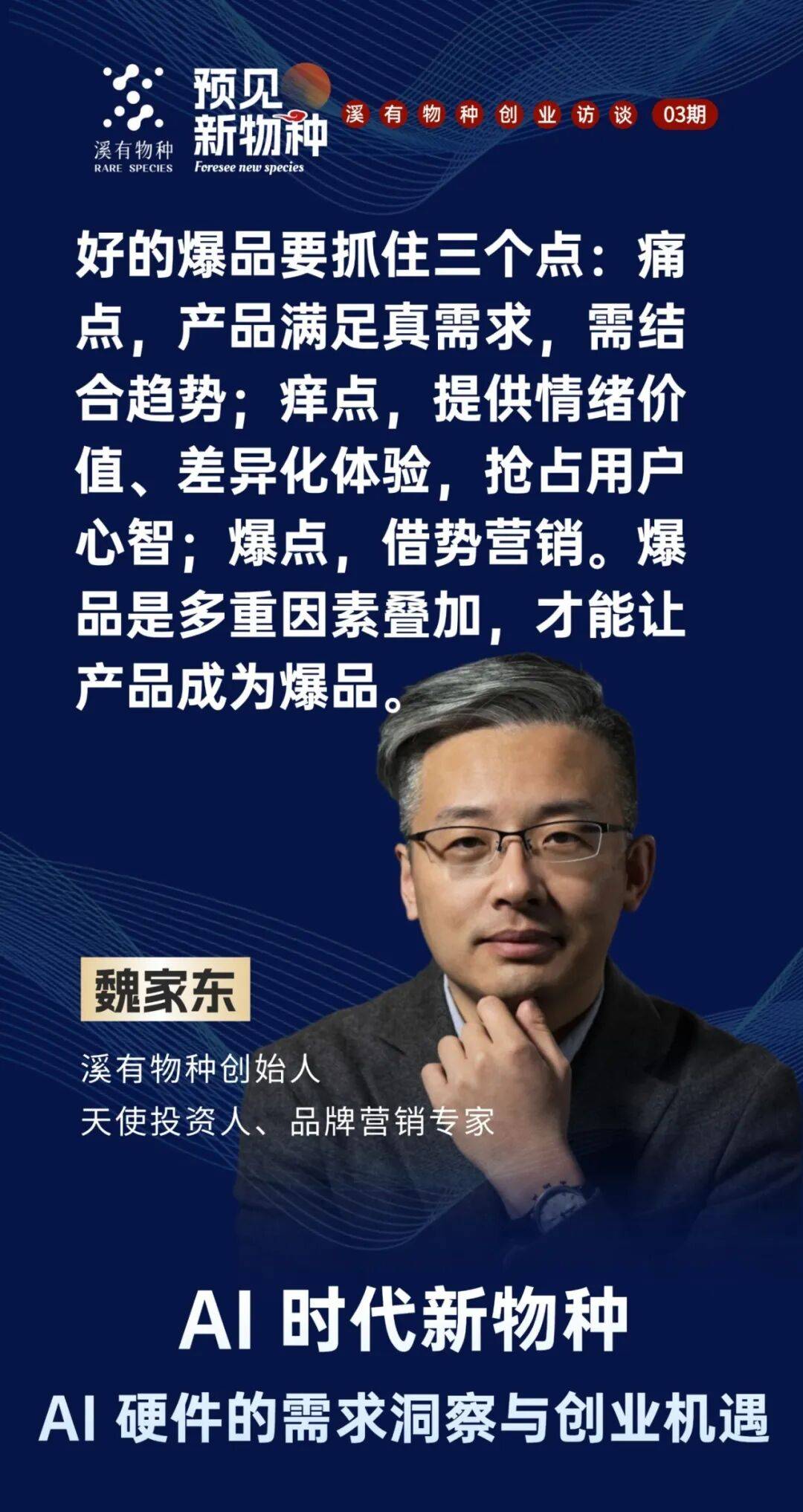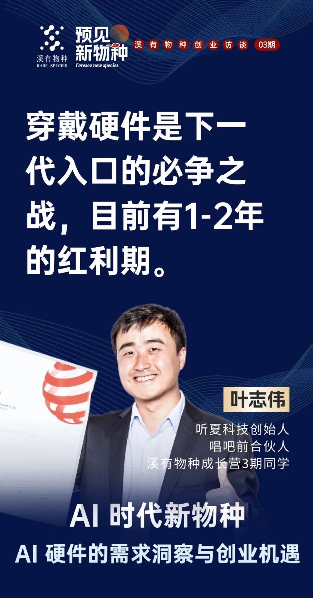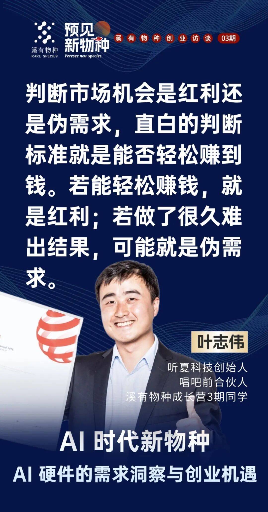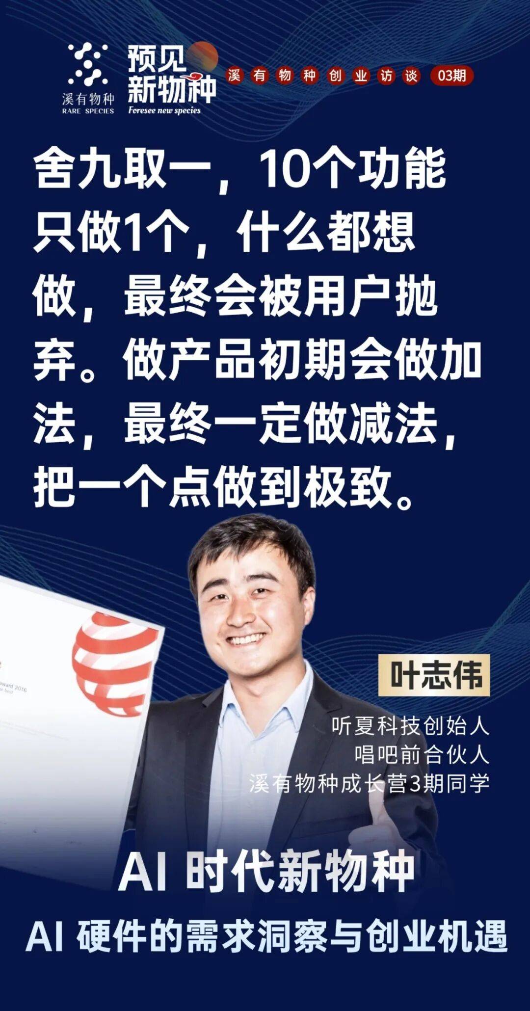 我还有更系统的判断尺度,有几个点供大师思虑,溪有创始人魏家东曲播对线期同窗、 听夏科技创始人、唱吧前合股人(前硬件总裁)叶志伟 配合切磋 AI 硬件的需求洞察取创业机缘。